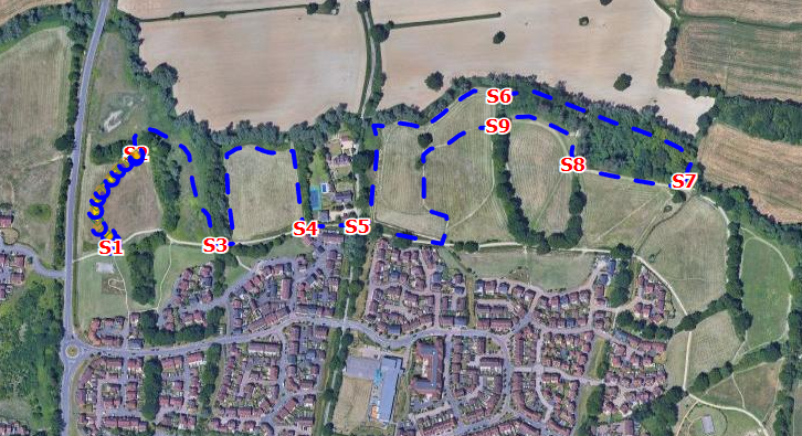 The transect route starts at the interpretation board in Lower Five Acres field, just off Orchard Drive.